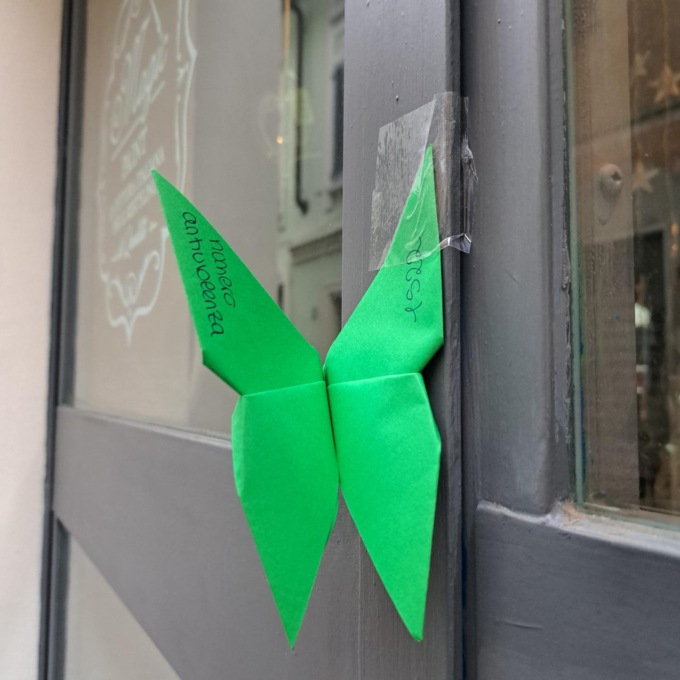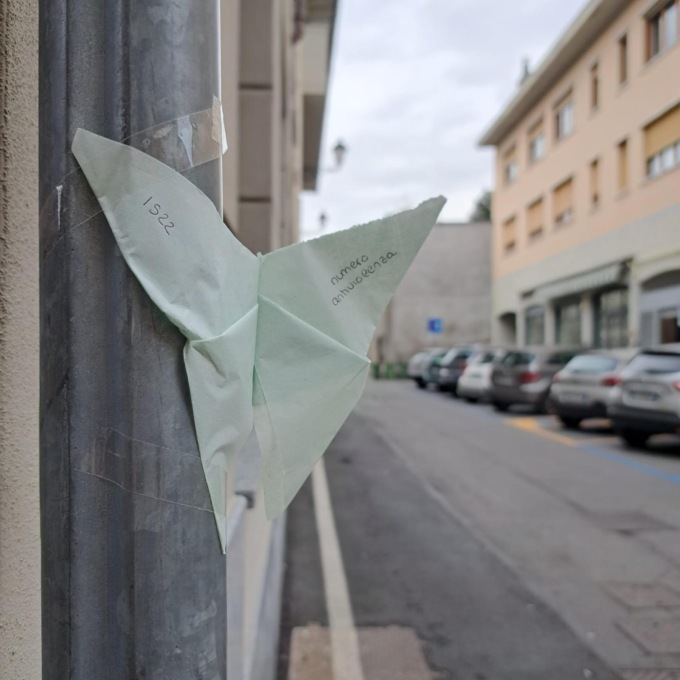 Nella mattinata, in città, sono comparse anche centinaia di farfalle colorate realizzate con la carte e affisse in diversi punti del centro su cui è annotato il numero d’emergenza 1522.