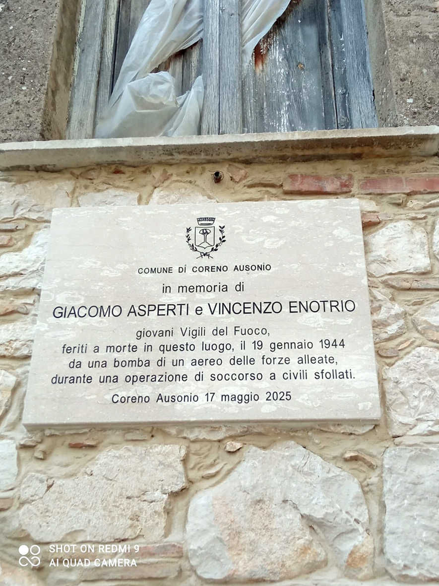 Giacomo Asperti e Vincenzo Enotrio. Sono i nomi di due giovani Vigili del fuoco, caduti in guerra. Il primo era originario di Romano di Lombardia. D’ora in poi, una targa ricorderà il loro sacrificio: è stata scoperta sabato scorso a Coreno Ausonio, in provincia di Latina.