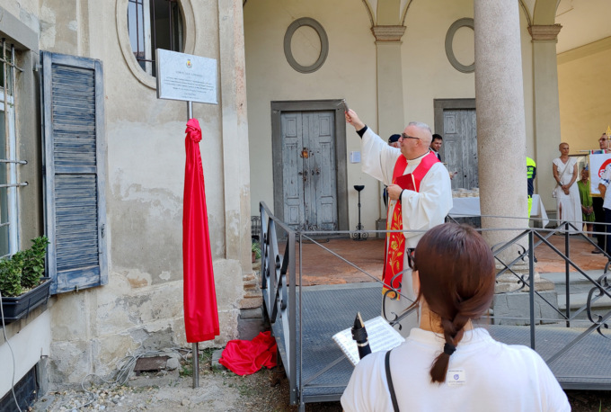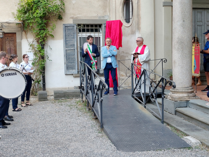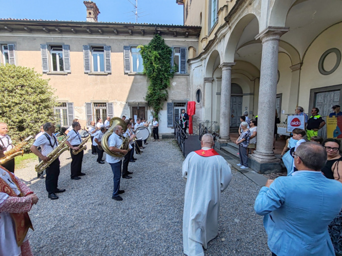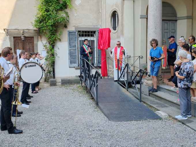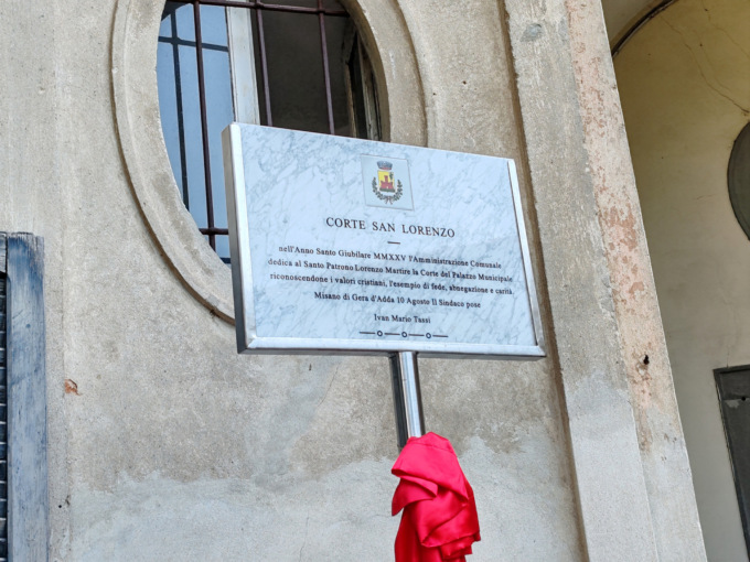 “Corte San Lorenzo – nell’anno Santo Giubilare MMXXV L’Amministrazione Comunale dedica al Santo Patrono Lorenzo Martire la corte del Palazzo Municipale riconoscendone i valori cristiani, l’esempio di fede, abnegazione e carità. Misano di Gera d’Adda 10 agosto, il Sindaco pose. Ivan Mario Tassi”.