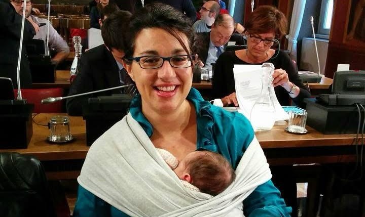 Francesca Riccardi, capogruppo del Pd in Consiglio comunale a Bergamo, in Aula poco dopo la gravidanza  con la figlia Lucrezia, nata solo 10 giorni prima.