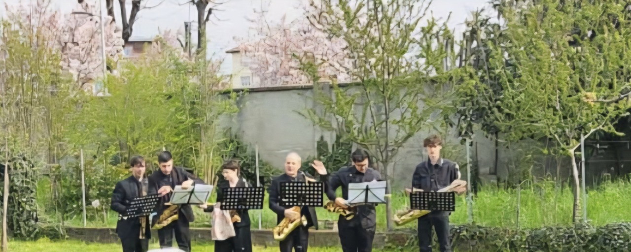 Nell’Orto Botanico di via Casnida, intorno alle 11, tra erbe aromatiche e alberi da frutto, un breve concerto e un aperitivo hanno atteso i passanti dopo la passeggiata tra i ciliegi in fiore. Grazie alla generosa ospitalità della Fondazione Portaluppi, con la “regia” di Bruno Goisis, i presenti sono stati accolti nell’Orto, dove è stato offerto un brindisi con uno spuntino e dove un gruppo di giovani saxofonisti della BryOrchestra di Musica per Passione ha eseguito un piacevole intrattenimento musicale, con la guida del Maestro Filiberto Guerra.