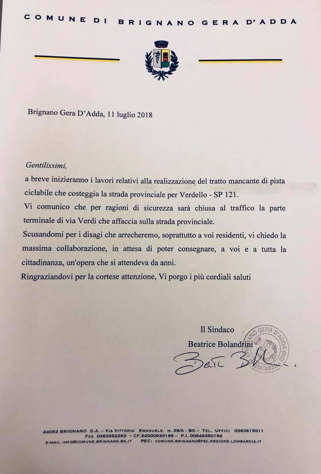 I lavori inizieranno il 16 luglio. “Questa era un’opera attesa da tempo – ha detto il sindaco Beatrice Bolandrini – che la comunità richiedeva. Perché, infatti, ad opera conclusa i cittadini potranno spostarsi lungo la Sp 121 in piena sicurezza e inoltre dal rondò che va verso Treviglio prendere l’altra ciclabile, qualora ci si volesse dirigere verso ovest. Insomma, completando la ciclabile si dà un servizio importante a tutta la comunità”.