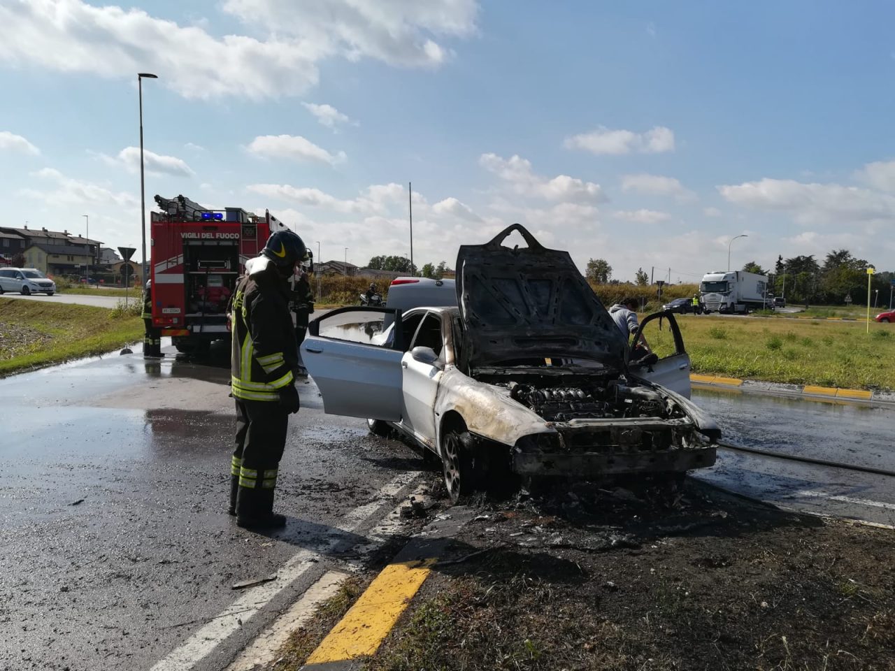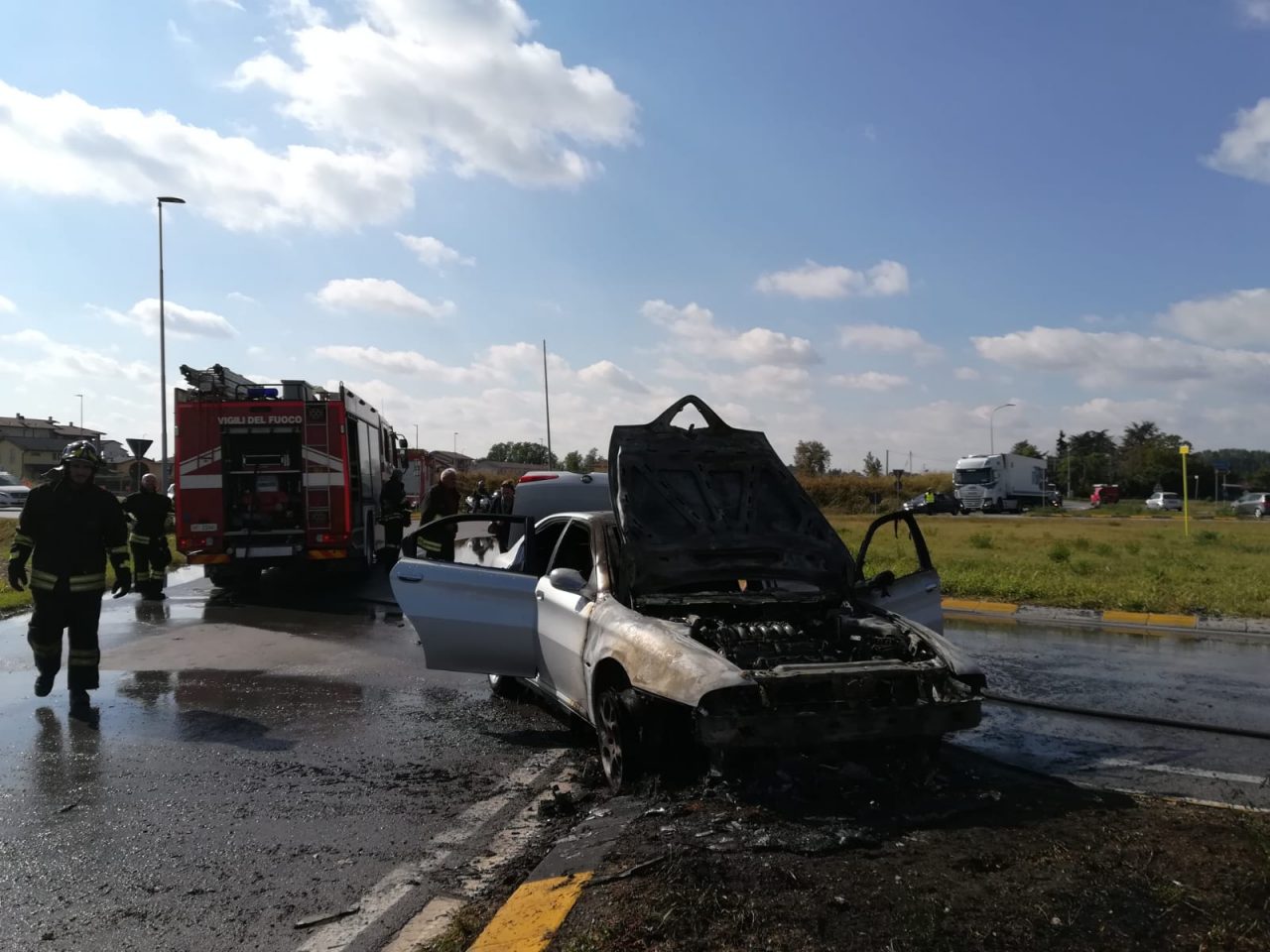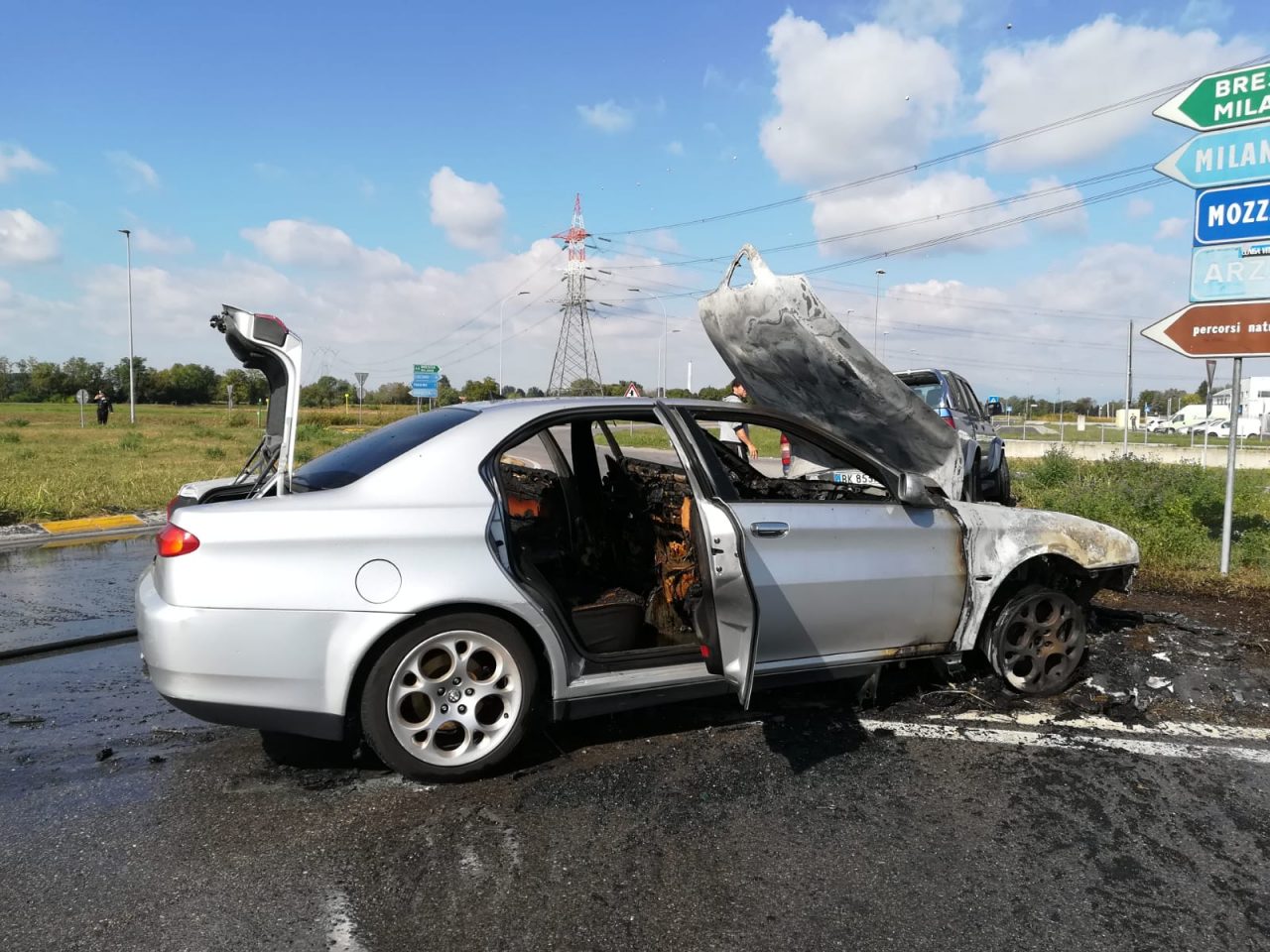 La proprietaria, Paola, di Casirate, stava tornando a casa da Rivolta a bordo della sua vecchia Alfa Romeo 166 alimentata a Gpl. Durante il tragitto ha sentito degli strani rumori e ha visto del fumo uscire dall’auto. Spaventata, comprendendo che stava succedendo qualcosa, la donna ha immediatamente fermato l’auto sulla rotonda ed è scesa dal mezzo di corsa. Appena in tempo. Subito dopo che la proprietaria si era allontanata l’auto ha percorso qualche metro e ha preso fuoco. E’ stata la stessa conducente ad allertare i soccorsi.