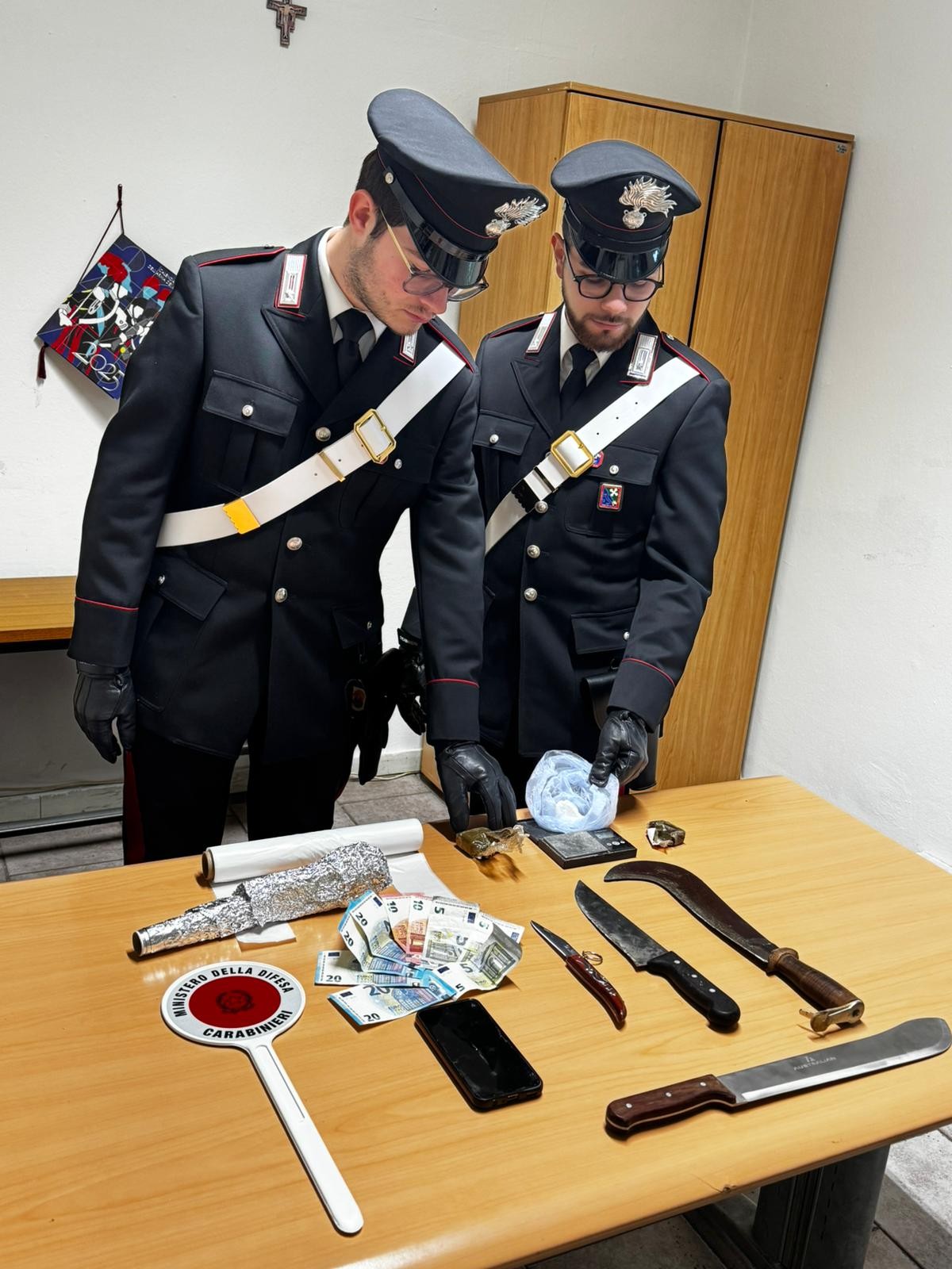 L’ispezione del locale, caratterizzato da un forte odore di hashish, ha consentito di rinvenire e sequestrare circa 70 grammi di hashish e 31 grammi di cocaina. Sotto il materasso e tra i mobili sono stati rinvenuti un machete, una roncola, un coltello a serramanico e un coltello da cucina con lama di 21 cm, quest’ultimo ancora sporco di sostanza stupefacente. Oltre a un bilancino di precisione e materiale per il confezionamento, i militari hanno anche rinvenuto un manoscritto con nomi, cifre e pesi, riconducibile alla gestione contabile delle vendite