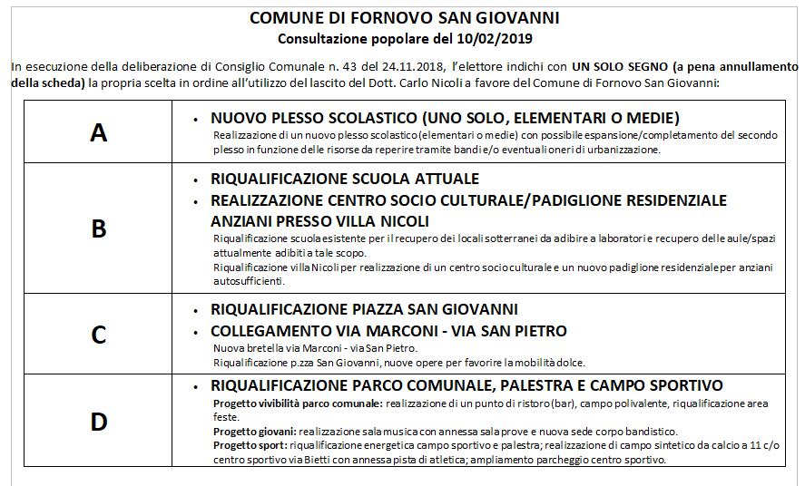 I cittadini di Fornovo saranno chiamati ad esprimersi su come investire i 2.5 milioni di euro del lascito Nicoli. Quattro le opzioni che si troveranno sulla scheda il 10 febbraio prossimo.