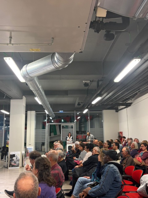A chiudere la serata è l’intervento di Laila Awad, che si presenta come rappresentante dell’Associazione Amicizia Bergamo Palestina ricordando il progetto “Un’ambulanza per Gaza”, un sostegno sanitario e politico legato all’ospedale Al-Awda. Richiama anche il suo ruolo nei Giovani Palestinesi d’Italia: “non siamo semplicemente solidali con questa lotta, ma ne siamo del tutto interni”.