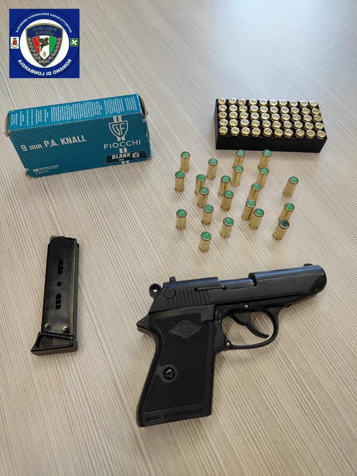 Sottoposto a perquisizione personale, veniva trovato in possesso una pistola automatica calibro 9, risultata arma a salve ma priva del tappo rosso occlusivo della canna, quindi nell’aspetto identica ad un’arma a fuoco. Oltre alla pistola, l’uomo era in possesso di 71 cartucce cariche.