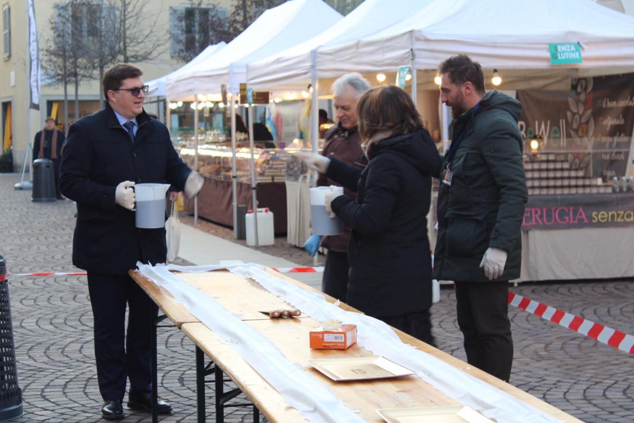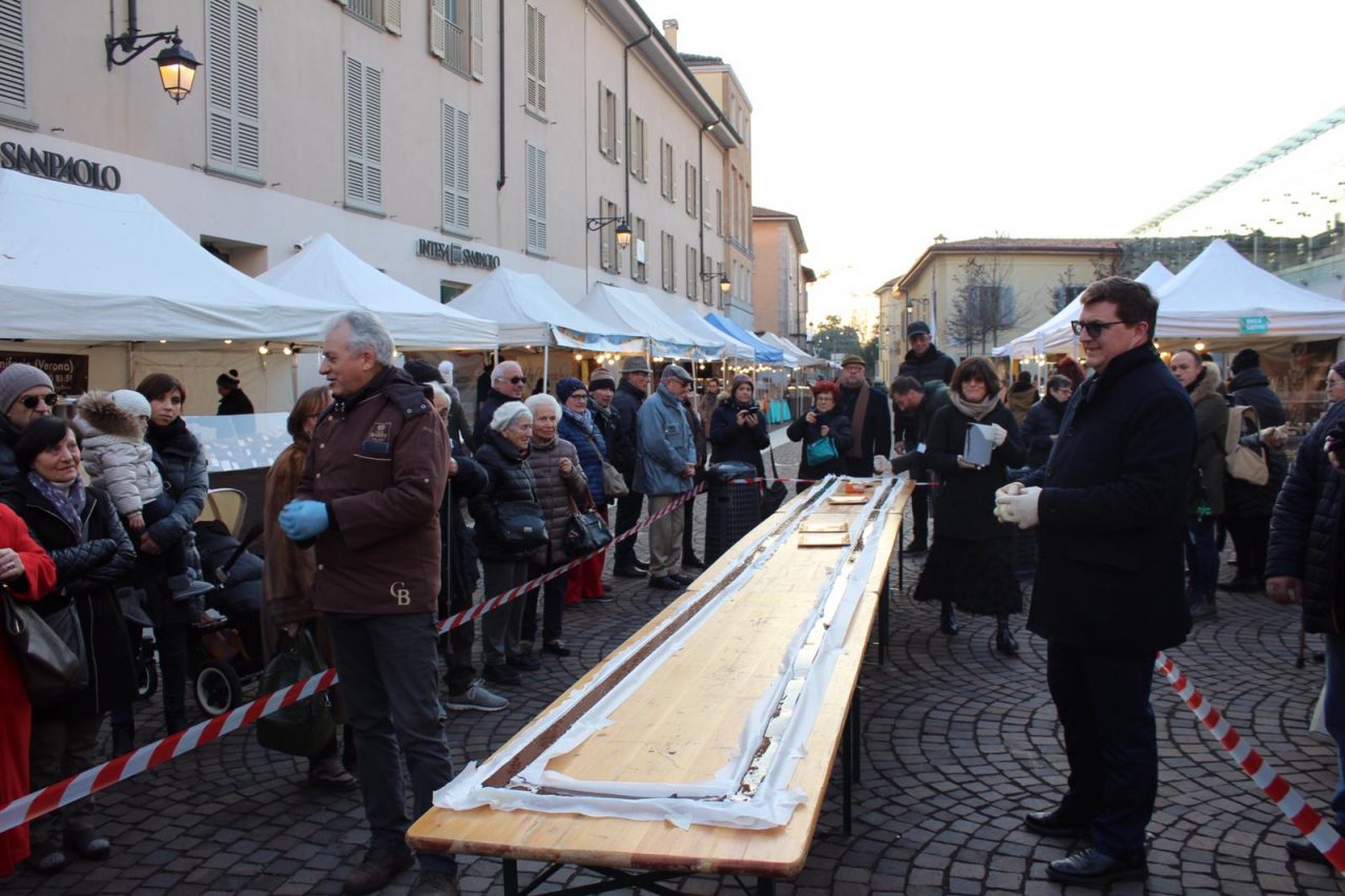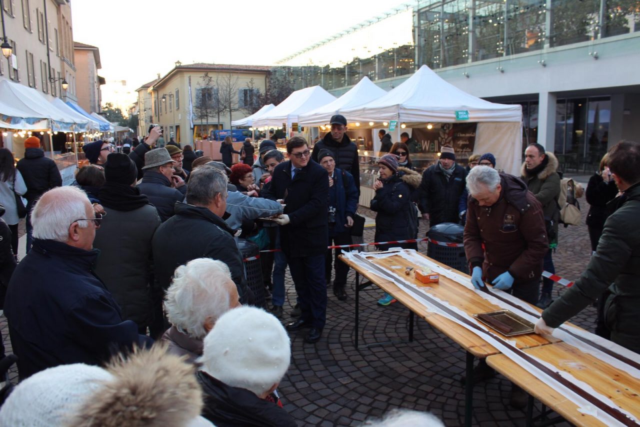 Alle 16 grazie ai cioccolatieri vicentini di Stringhetto, il sindaco Juri Imeri ha versato 15 chili di cioccolato fuso in un enorme stampo costruito in piazza, tra le bancarelle della manifestazione. Presente in piazza anche il presidente dell’associazione commercianti Gabriele Anghinoni. In pochi minuti, complice il freddo, il cioccolato si è solidificato e la tavoletta è stata distribuita tra i passanti incuriositi.