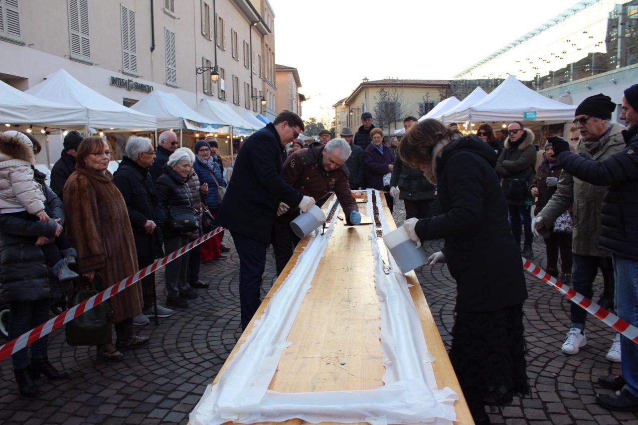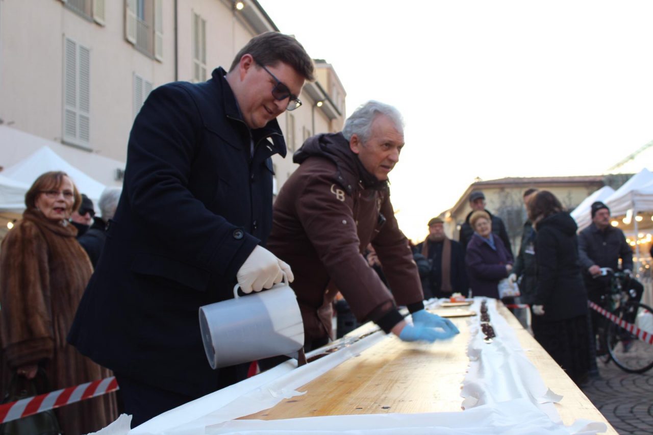 Quindici chili di cioccolato fondente 70%, in un’unica mega tavoletta da quindici metri. Si è inaugurata così ieri pomeriggio in piazza Garibaldi la sesta edizione di Treviglio al cioccolato, la manifestazione dedicata all’ “oro nero” della tavola organizzata per questo weekend (QUI il programma).