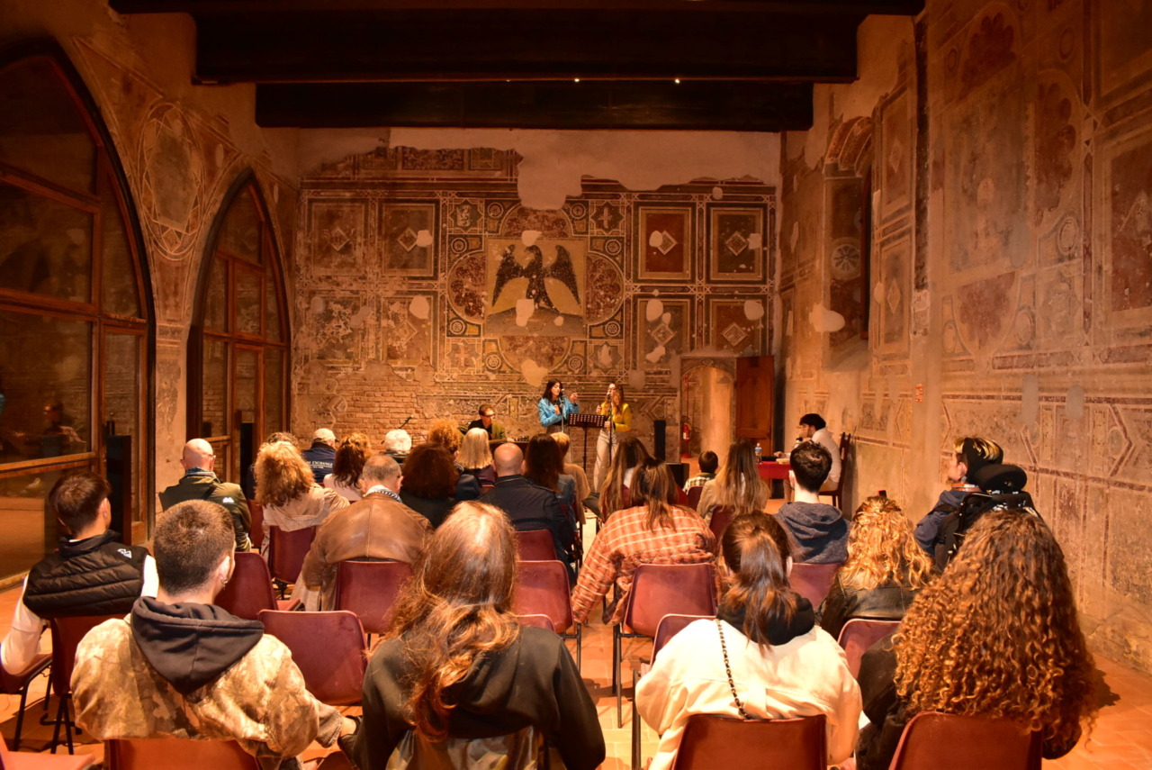 Il Festival è entrato nel vivo da sabato, sempre all’interno del castello visconteo. Alle 10.30, sotto un cielo grigio, il laboratorio di murales ha iniziato a colorare i pannelli tra schizzi e pioggia, come se il tempo non potesse spegnere l’urgenza di esprimersi. La Consulta Giovani di Castelleone ha aperto un dialogo intenso collegandosi con due ragazzi dall’estero: si è parlato di fuga di cervelli, sogni e necessità, di cosa significhi partire, restare o tornare.