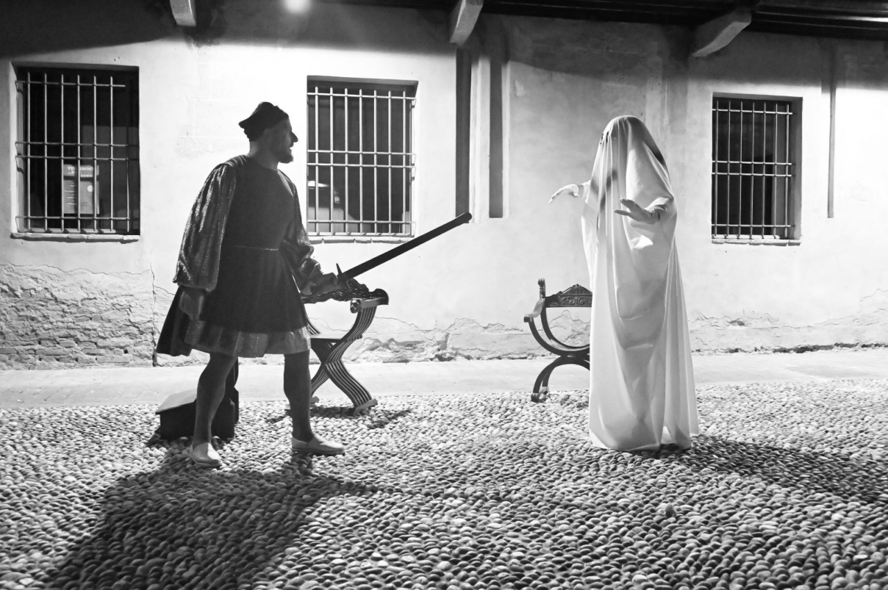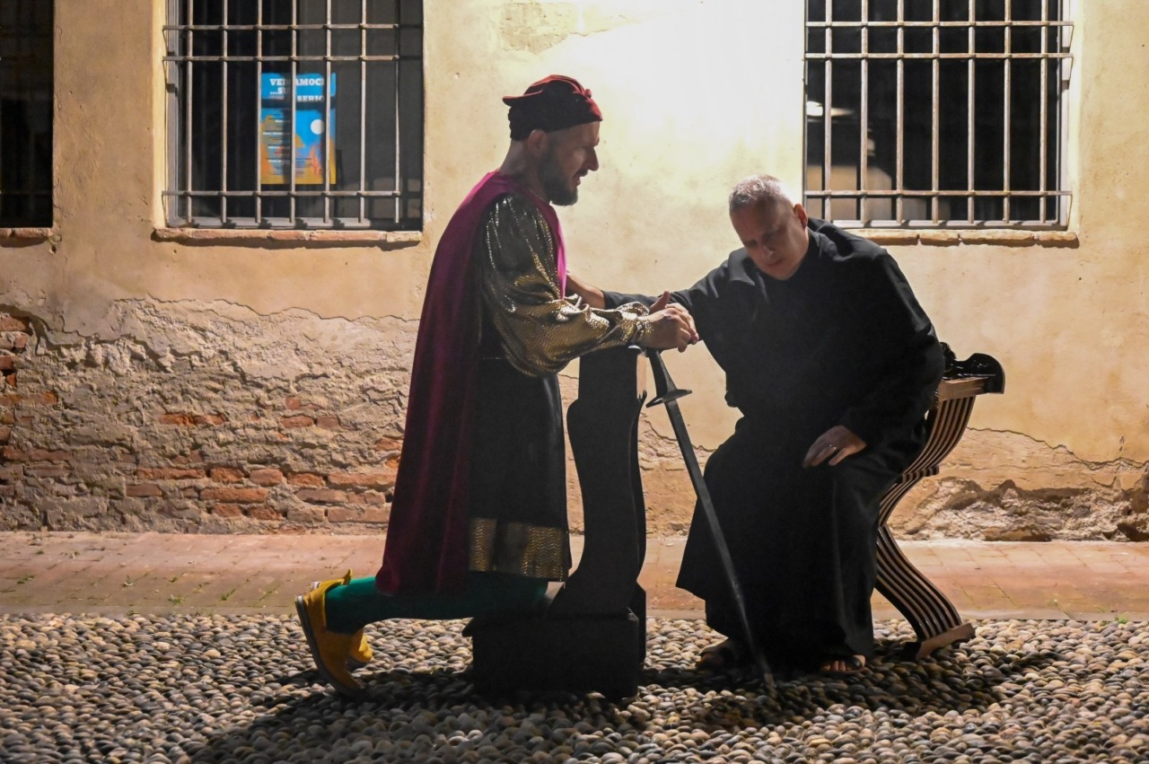 Trittico immaginario: Colleoni condottiero, marito e padre. Questo lo spettacolo che è stato messo in scena domenica sera dalla Compagnia teatrale “Quelli dei Cappuccini” alla Rocca di Romano nell’ambito della rassegna Romano medievale. Una rappresentazione teatrale che pur mantenendo uno stile ironico e parodistico, ha rispettato fedelmente le vicende storiche e personali di Bartolomeo Colleoni, offrendo un ritratto umano del celebre condottiero. Al centro della scena c’è Bartolomeo Colleoni, figura imponente e temeraria, il cui coraggio e la cui astuzia militare sono noti nei secoli. La pièce ripercorre alcune delle sue gesta più celebri, mescolando storicità e leggerezza comica. A fianco del protagonista, Fra Callisto, confessore inventato della compagnia, accompagna Colleoni nei momenti di riflessione, aggiungendo un tocco di ironia alle dinamiche storiche, senza alterare la sostanza dei fatti.