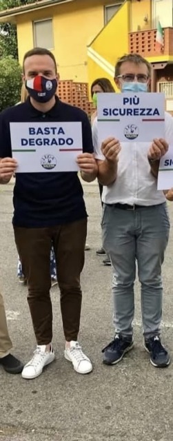 Alla ripresa della seduta, tuttavia, il clima di collaborazione è rapidamente degenerato. Nel suo intervento, Allevi ha sottolineato lo stile collaborativo, propositivo e la postura con la quale le minoranze hanno trattato il tema, ricordando come in passato invece alcuni attuali esponenti della maggioranza — tra cui lo stesso Paolo Patelli, all’epoca consigliere di minoranza della Lega Salvini Premier, e l’attuale vicesindaco Andrea Nozza — si fossero invece limitati a manifestare pubblicamente in piazza con sterili slogan sul tema della sicurezza. Era infatti il giugno del 2021 quando Nozza e Patelli, allora consiglieri di minoranza in quota Lega Salvini Premier, parteciparono ad un presidio organizzato dalla sezione cittadina della Lega per Salvini Premier in segno di protesta e di sensibilizzazione dopo una lunga serie di atti vandalici che avevano colpito Romano, in particolare un episodio, quando un gruppo di quindici giovani devastarono un distributore automatico dell’acqua. Paolo Patelli Andrea Nozza muniti di cartelli con scritto “basta degrado” e “più sicurezza”( vedi la foto, ndr), insieme ad altri esponenti politici della Lega manifestarono proprio davanti al distributore devastato.