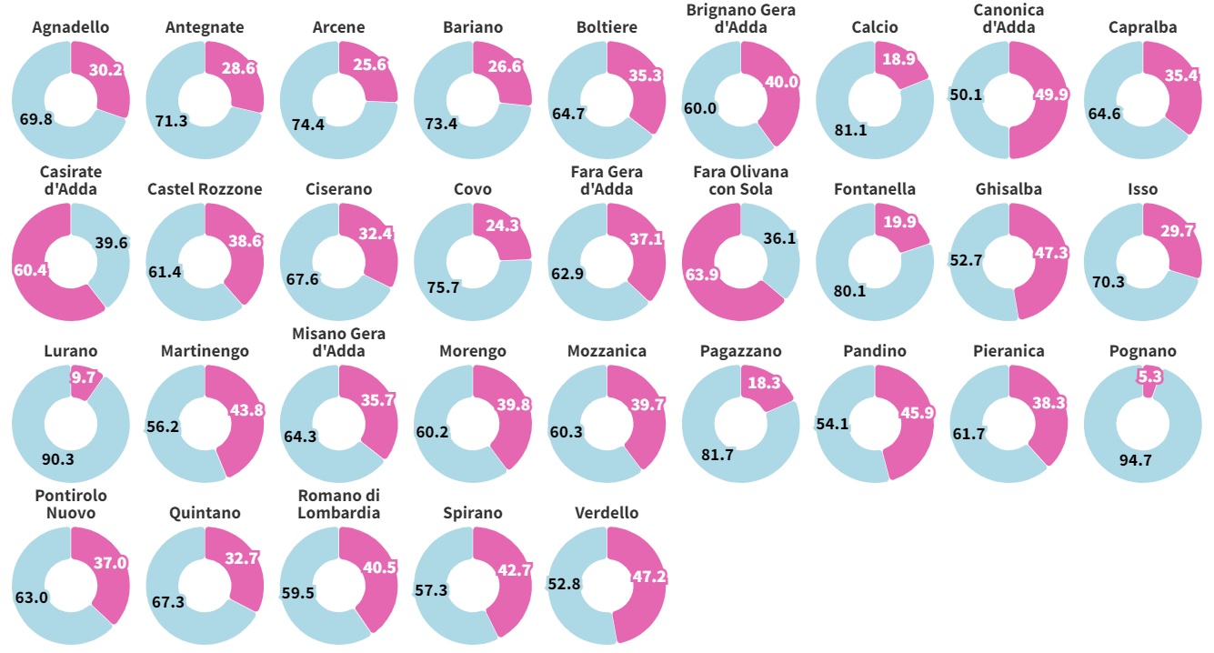 Una discrasia che si riflette inevitabilmente sulla rappresentanza. I Consigli comunali eletti l’8 e 9 giugno sono spiccatamente a preponderanza maschile, con sole dieci eccezioni su 32: risultano più consigliere che consiglieri eletti soltanto a Casirate, Canonica, Ciserano, Fara Olivana, Ghisalba e Barbata, mentre il pareggio di genere si raggiunge a Brignano, Lurano, Mozzanica e Verdello. In tutti gli altri paesi, a guidare il Comune sarà un’Assise più maschile che femminile, nella «migliore tradizione» patriarcale.