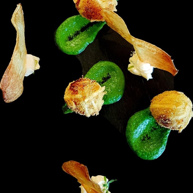 Impiattamento: stendi una pennellata di cremoso, disponi tre bon bon, aggiungi punti di pesto e completa con una patata cristallo per dare altezza e un tocco scenografico.