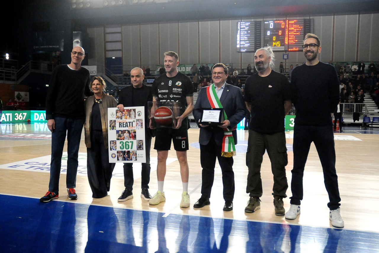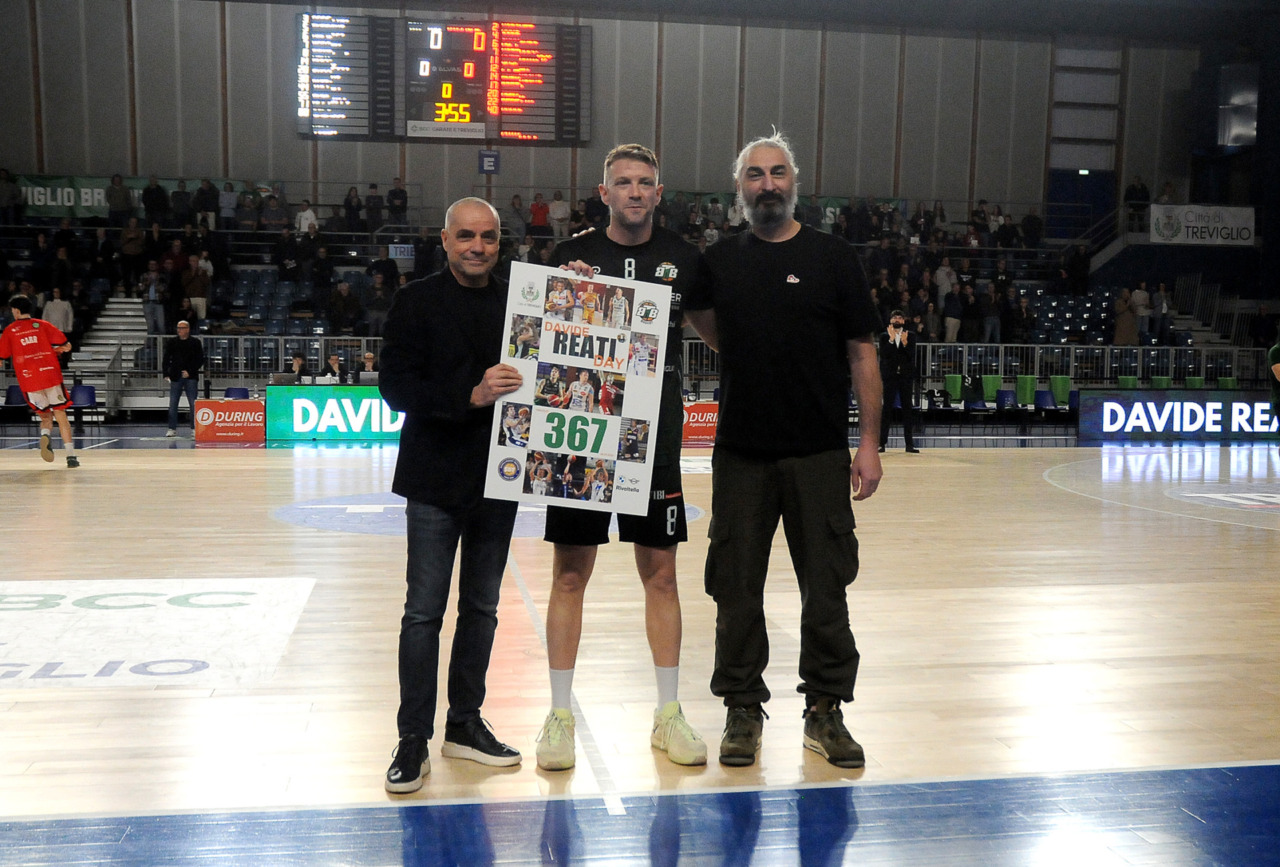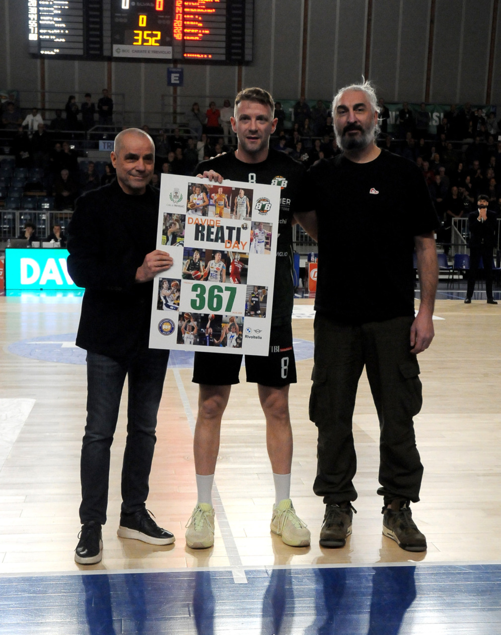 Le celebrazioni per il capitano Davide Reati che a 37 anni ha toccato il record di presenze con la canotta di Treviglio, uguagliando l’ex compagno Enrico “Eda” Degli Agosti. Per il giocatore di Cernusco sul Naviglio il Comune di Treviglio ha fatto realizzare una cartolina celebrativa, il sindaco Juri Imeri gli ha consegnato una targa celebrativa, insieme all’ex capitano Emanuele Rossi. Il presidente della Treviglio Brianza Basket, Paolo Luinetti, insieme ad un altro ex capitano di Treviglio, Luca Gamba, ha consegnato al giocatore della Tav una gigantografia con le immagini delle 13 stagioni che Reati ha vissuto in città e, infine, Eda Degli Agosti insieme alla presidentessa della Scuola Basket Treviglio – la prima società nella quale Davide ha militato al suo arrivo a Treviglio – Viviana Bonacina gli hanno fatto dono del pallone della partita. Omaggiate con mazzi di fiori, consegnati da Angelo Soliveri, main sponsor e presidente del Consorzio Treviglio Brianza Basket, anche le due donne del capitano, la moglie Daniela e la figlia Alessia. Sul parquet, poi, nel match contro Vicenza, il capitano ha contribuito alla vittoria 90-82 dei biancoverdi di coach Davide Villa “fatturando” in 28 minuti abbondanti giocati 10 punti con 3/4 dal campo (2/3 da tre), 3 rimbalzi catturati e 5 falli subiti. Al termine della gallery un approfondimento sulla partita.