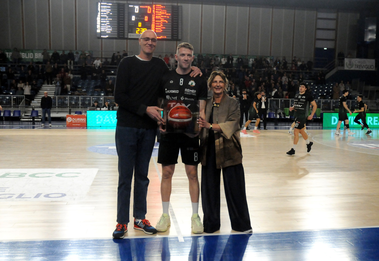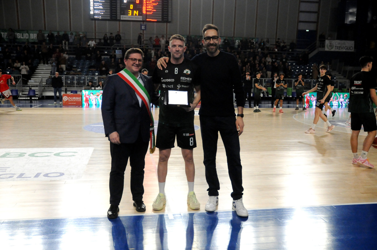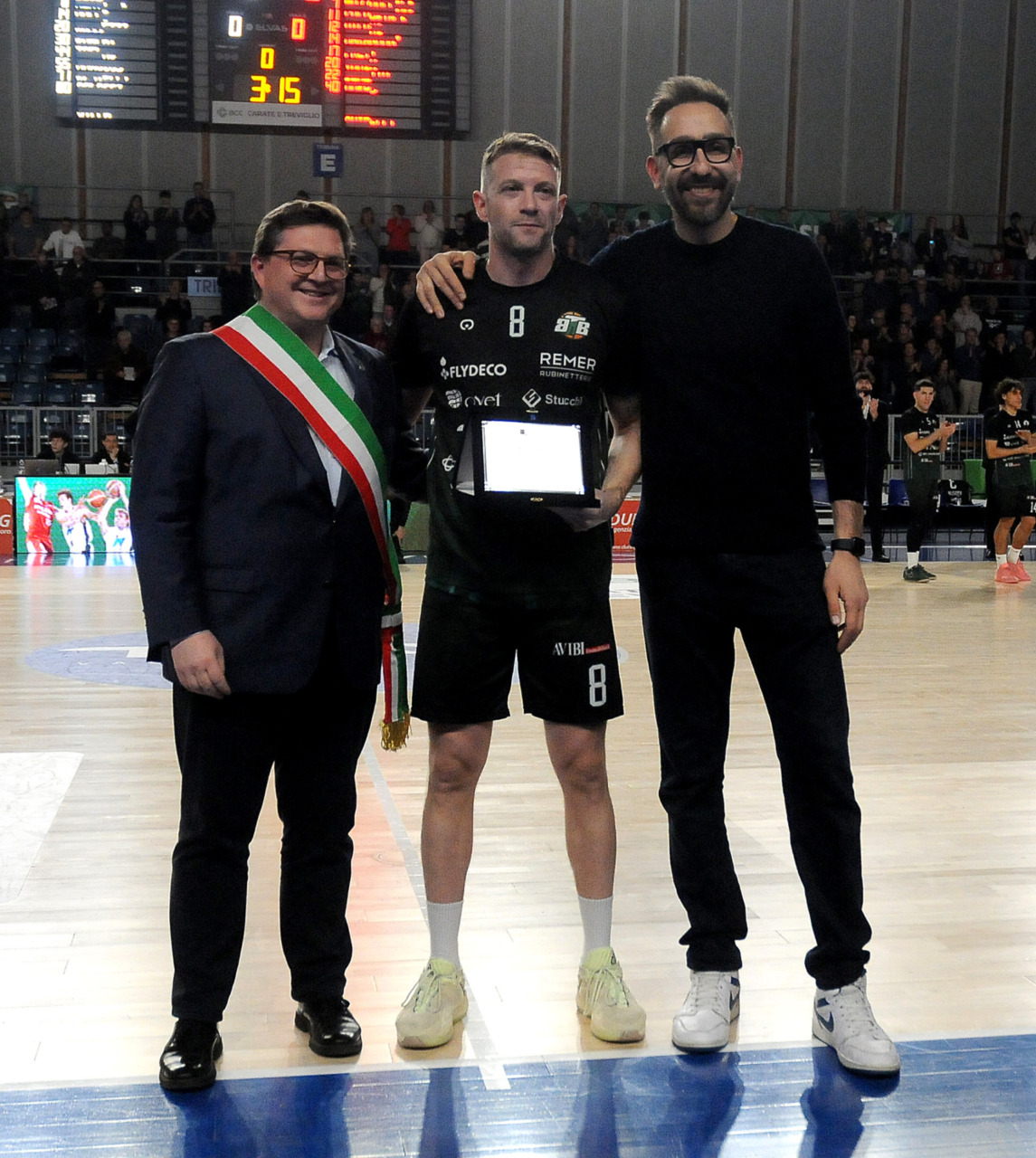 Le celebrazioni per il capitano Davide Reati che a 37 anni ha toccato il record di presenze con la canotta di Treviglio, uguagliando l’ex compagno Enrico “Eda” Degli Agosti. Per il giocatore di Cernusco sul Naviglio il Comune di Treviglio ha fatto realizzare una cartolina celebrativa, il sindaco Juri Imeri gli ha consegnato una targa celebrativa, insieme all’ex capitano Emanuele Rossi. Il presidente della Treviglio Brianza Basket, Paolo Luinetti, insieme ad un altro ex capitano di Treviglio, Luca Gamba, ha consegnato al giocatore della Tav una gigantografia con le immagini delle 13 stagioni che Reati ha vissuto in città e, infine, Eda Degli Agosti insieme alla presidentessa della Scuola Basket Treviglio – la prima società nella quale Davide ha militato al suo arrivo a Treviglio – Viviana Bonacina gli hanno fatto dono del pallone della partita. Omaggiate con mazzi di fiori, consegnati da Angelo Soliveri, main sponsor e presidente del Consorzio Treviglio Brianza Basket, anche le due donne del capitano, la moglie Daniela e la figlia Alessia. Sul parquet, poi, nel match contro Vicenza, il capitano ha contribuito alla vittoria 90-82 dei biancoverdi di coach Davide Villa “fatturando” in 28 minuti abbondanti giocati 10 punti con 3/4 dal campo (2/3 da tre), 3 rimbalzi catturati e 5 falli subiti. Al termine della gallery un approfondimento sulla partita.