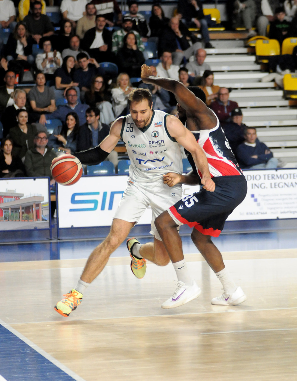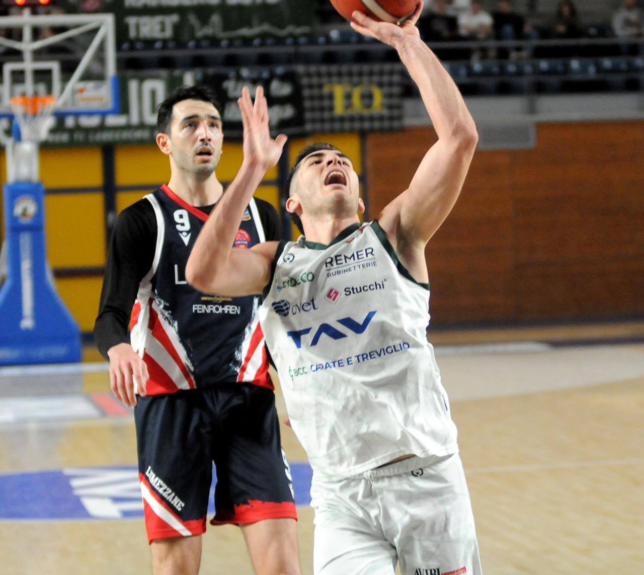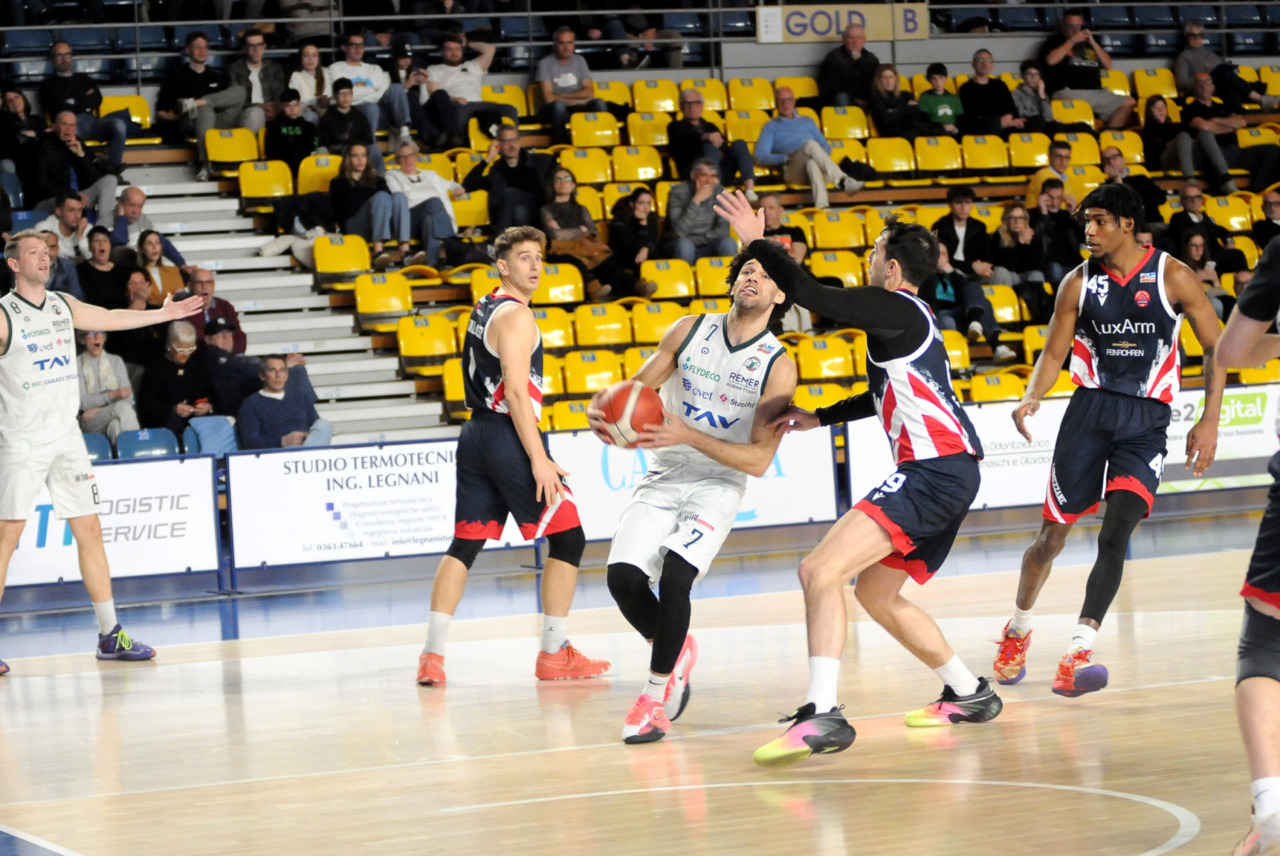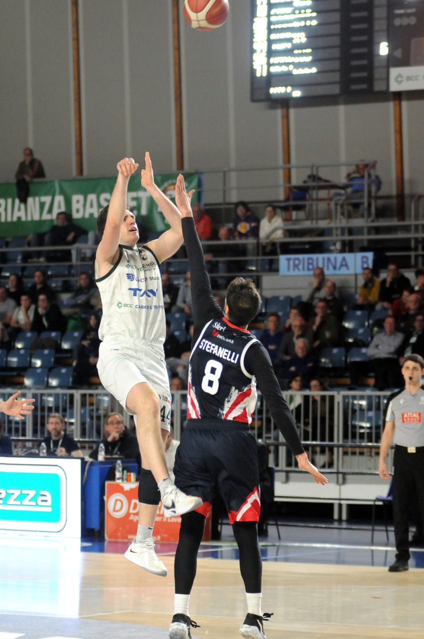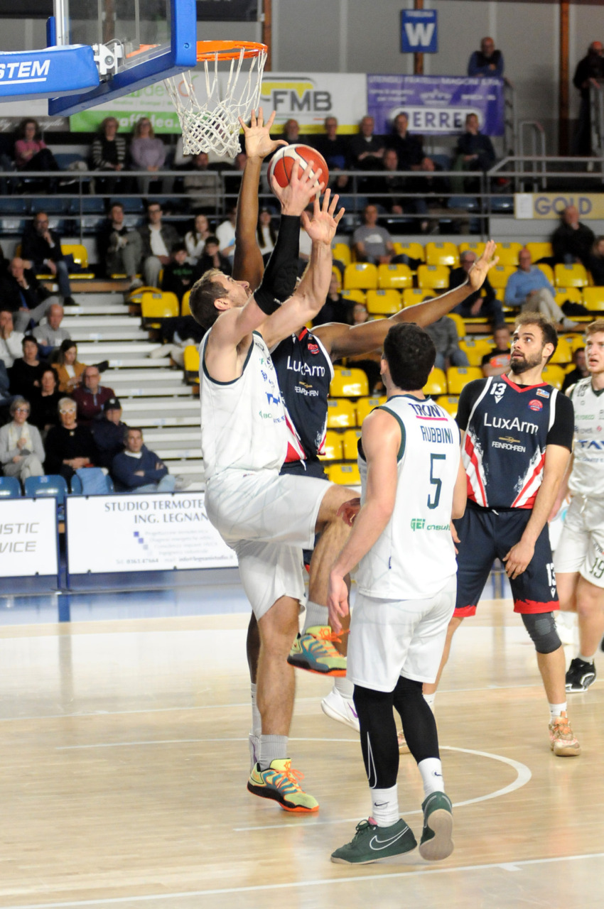 La vittoria 82-75 della Tav Treviglio Brianza sulla LuxArm Lumezzane, sabato sera nel turno pasquale del campionato di Serie B Nazionale, ha permesso alla squadra di coach Davide Villa di riscattare il ko della settimana precedente sul parquet della Fabo Herons Montecatini e ha rilanciato la corsa playoff. I biancoverdi, infatti, in graduatoria nel girone A sono saliti al quinto posto a quota 38 punti, appaiati proprio ai termali che hanno la differenza canestri a favore nello scontro diretto (+8), ma rispetto a capitan Davide Reati e compagni hanno ancora il turno di riposo da rispettare nelle quattro giornate che ancora mancano a chiudere la stagione regolare. In vetta, nel girone A, Vigevano (52 punti) è prossima a blindare la prima posizione, domenica 12 aprile lo scontro diretto tra la Gema Montecatini e Orzinuovi (46 punti) dirà chi sarà la diretta inseguitrice, mentre San Vendemiano (44 punti), quarta, ha già disputato in anticipo il match contro Omegna perso in casa il 13 marzo 90-79. Herons Montecatini, impegnato in trasferta a Fidenza, e Treviglio che riceve al PalaFacchetti domenica l’Assigeco Piacenza in un altro scontro diretto proveranno ad accorciare a 4 lunghezze il distacco dalla formazione veneta.